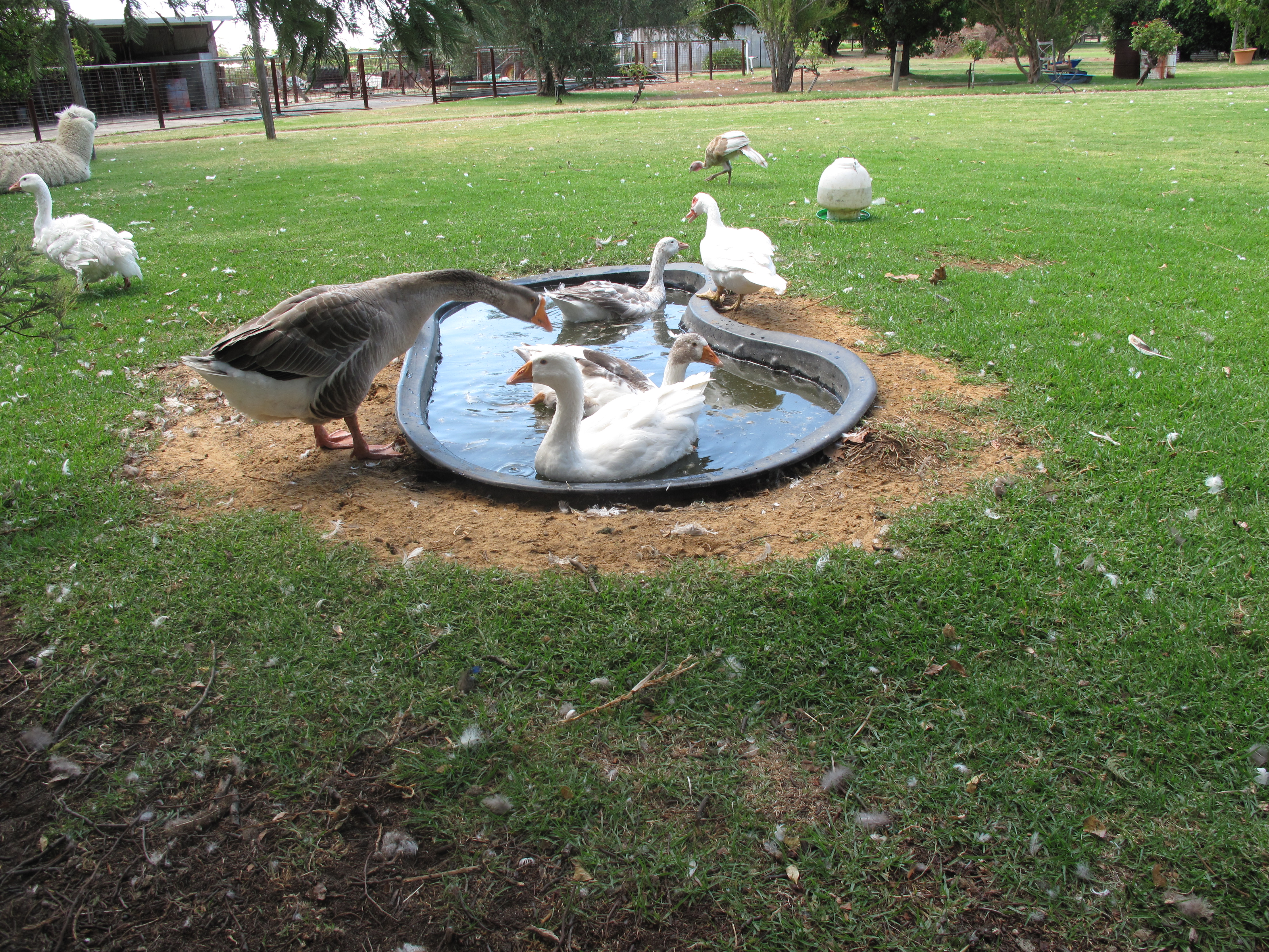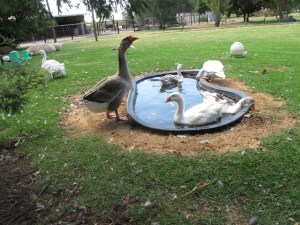 Godfrey (honking from a slight distance): Tomorrow’s meeting will commence at 6am sharp. We will form a working party consisting of three geese, one duck, one turkey and one – I repeat, one – emu. In the meantime the emus may continue to use the kiddy pool but not the pond. Agenda items:
