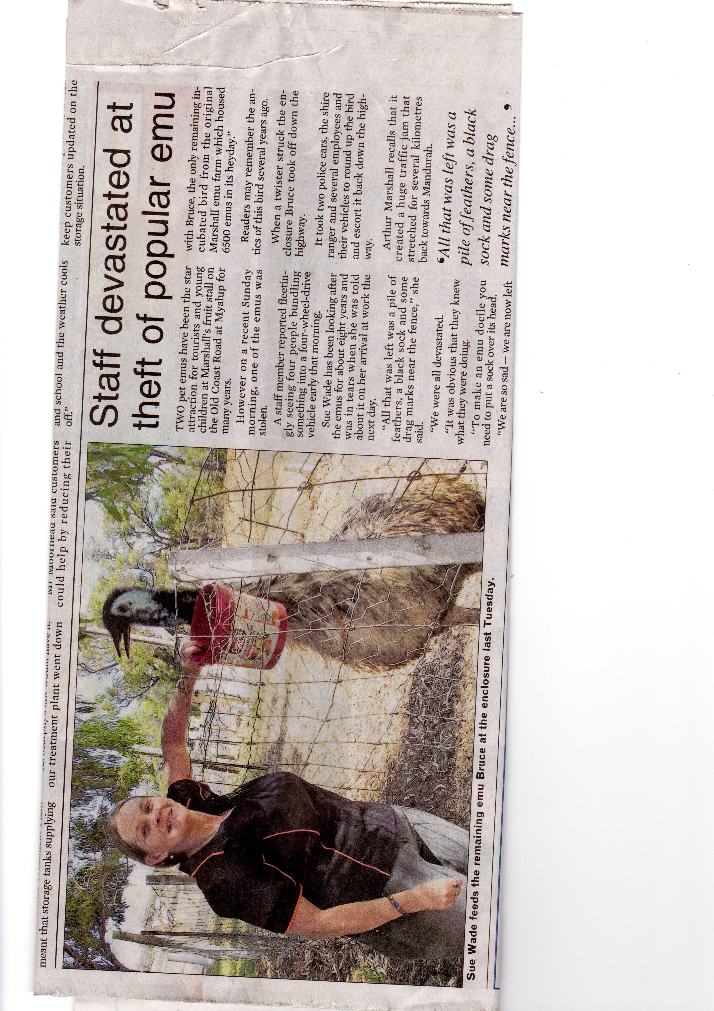 Even though they are in a big yard, I don’t like keeping the Emerys so confined but, as you know from previous posts, letting them out of their yard poses risks. For example, about 50 kms north of here, a pet emu was stolen recently. This has made me realize that human predators are much worse than foxes; the incident described in the news item below is distressing.