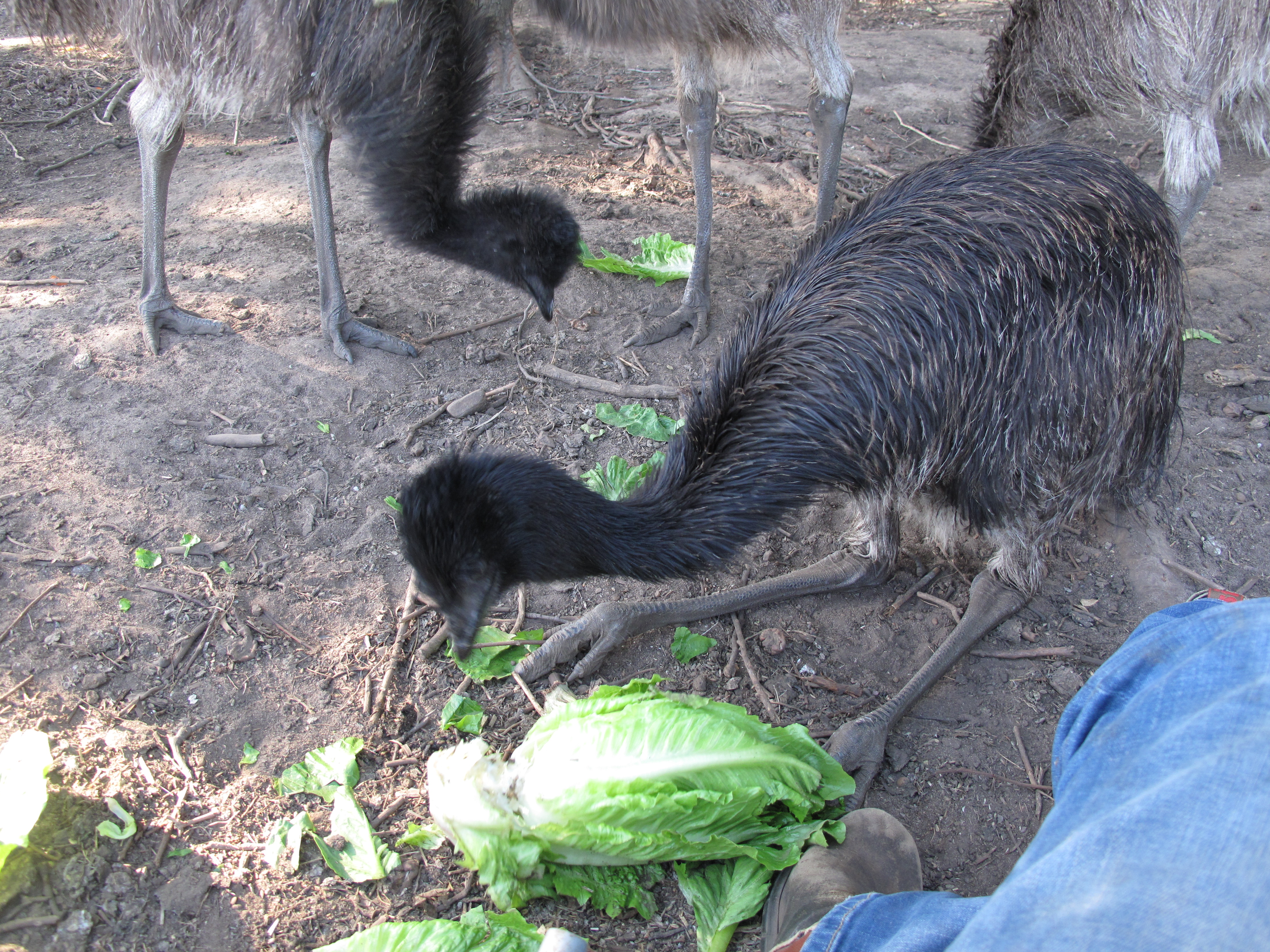 Only one of the emus saves her back by bending into a crouch to eat. She was also the first to figure out how to tear a lettuce apart by herself. Of course I am just assuming she is a ‘she’!