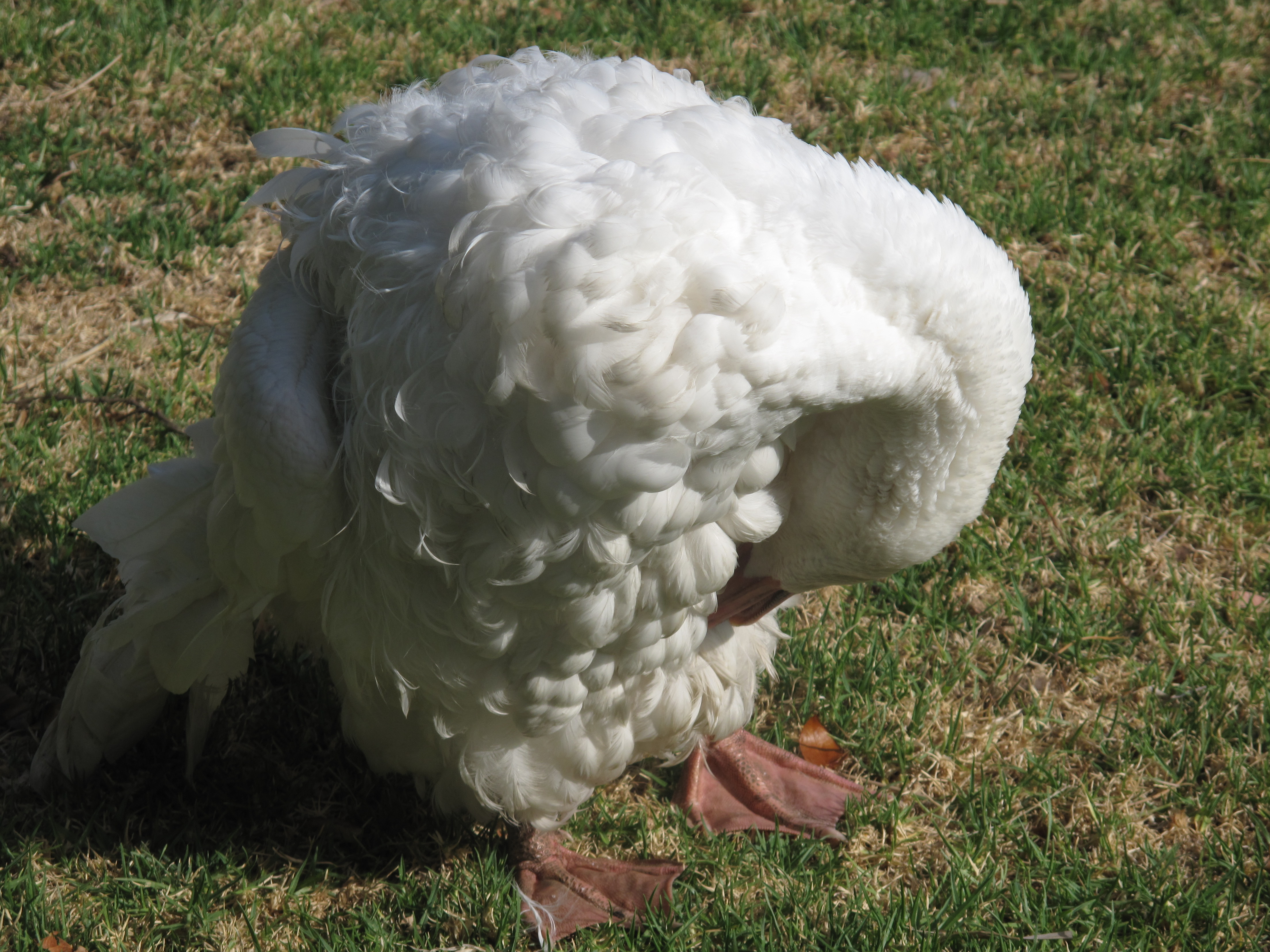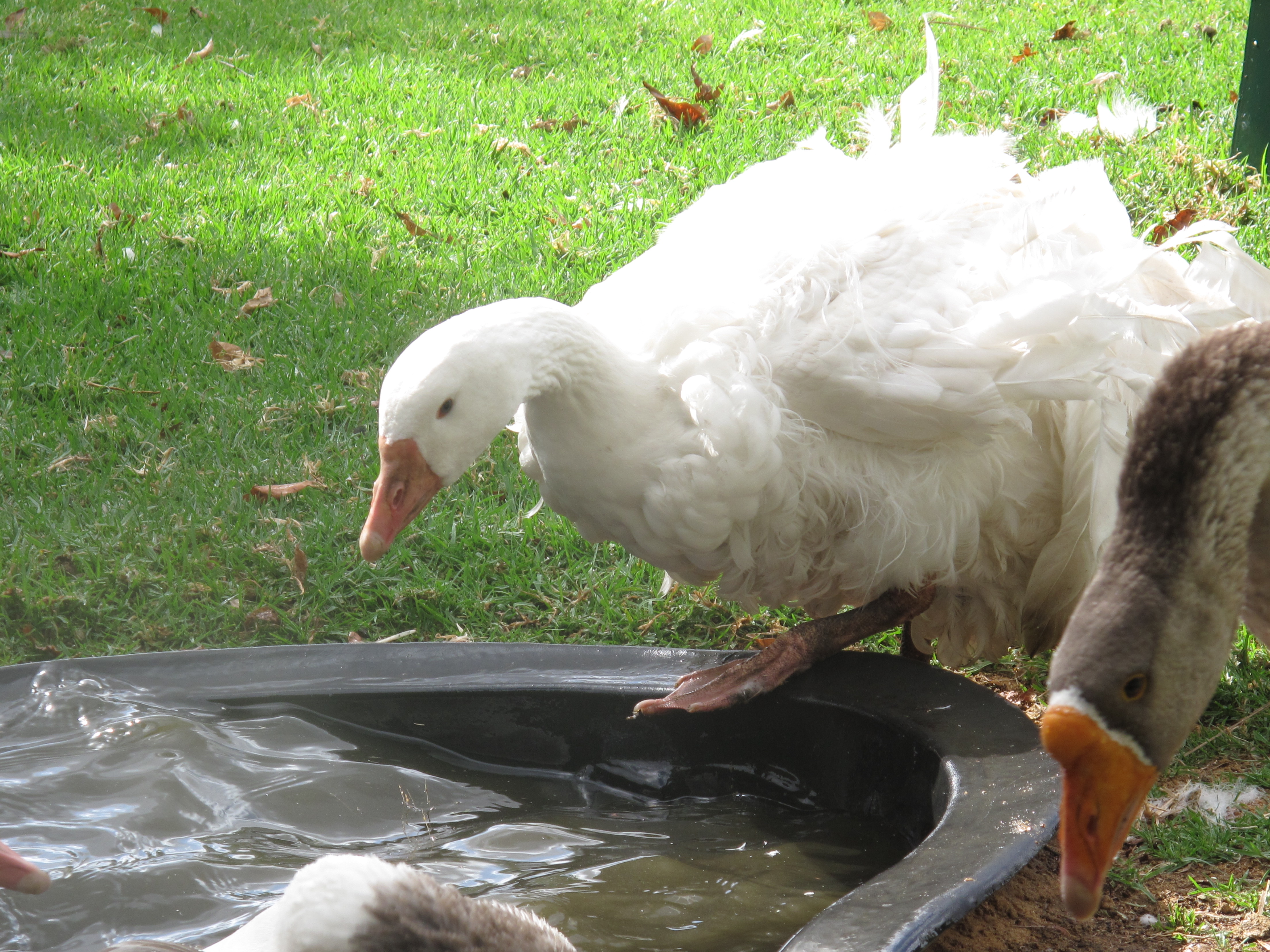Unlike Woodroffe (always very grubby), our other Sebastopol goose, Diamond, keeps her multitude of feathers very clean. This is her, wondering if she should venture into a bath already used by Woody, Zaruma and the other members of ‘the gang’. I can definitely understand her reticence!