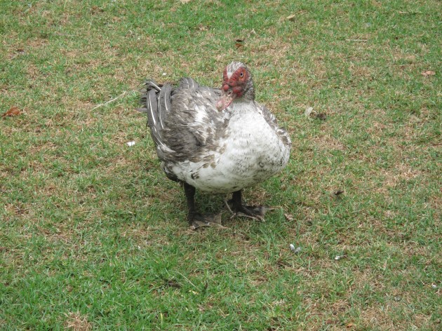 Well, it’s drizzling rain and I have the flu, so I rather miserably went outside to let the gang out of their pens later than usual this morning and, almost immediately, all these fights broke out. Seli (one of the ganders) was attacking Baby Turkey; Tapper (duck) had left her nest of unhatched eggs to give one of the Bubbles (turkey) a huge bite on the bum; and then the other Bubble and Zaruma (Tapper’s ‘husband’) started fighting viciously- really viciously. I had seen them do this before but this was really horrible so I kept trying to break them up and then all of a sudden, as I was yelling “Stop it!” they both ended up in the slimy green pool at the centre of the yard and, because I was so close and yelling, my mouth and nostrils were immediately filled with the goop of their splash and a wave of it speckled me from head to toe.