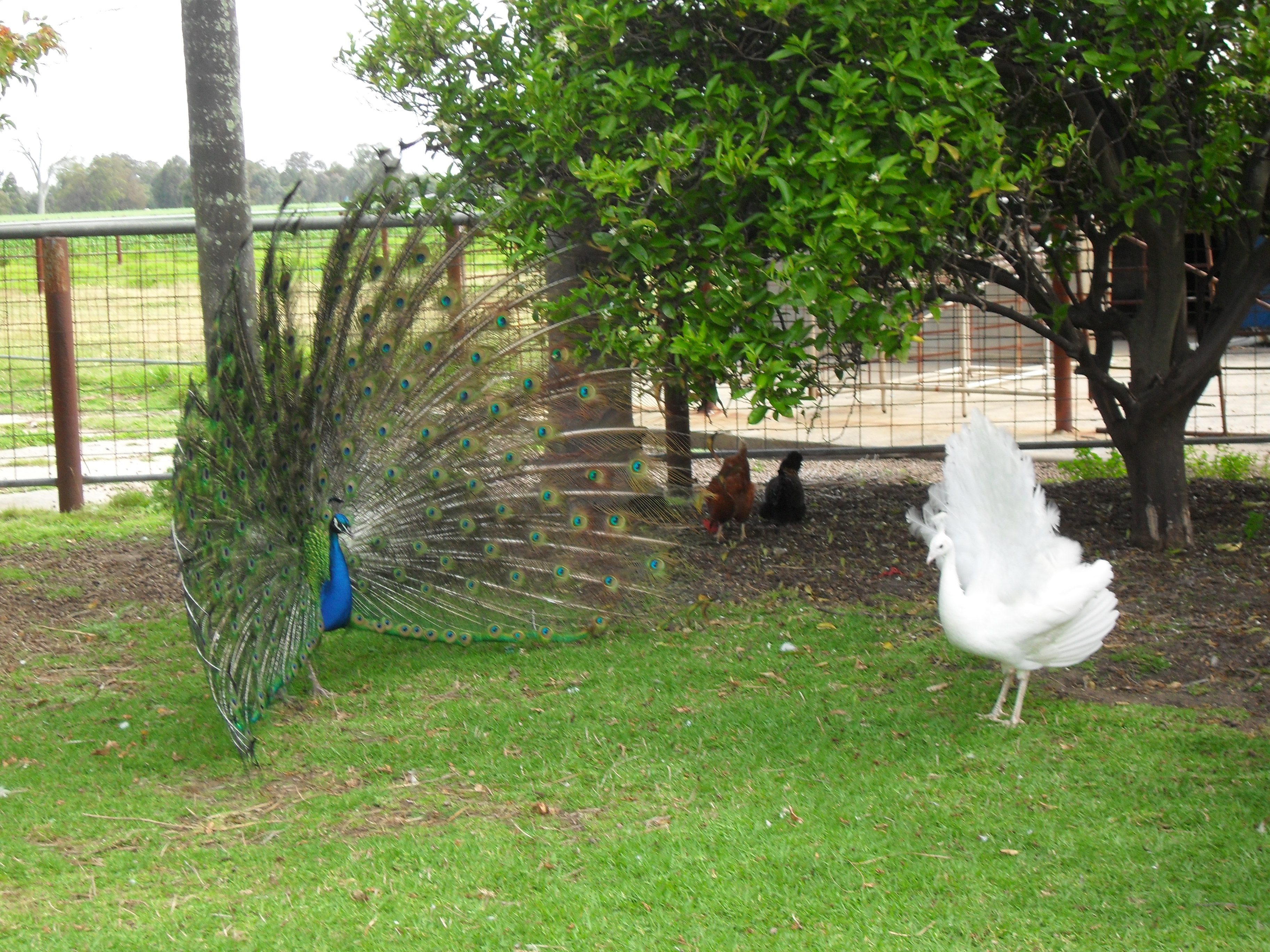 And the following photo is of him flaunting himself (a few months ago) in a winning competition with our adolescent white peacock.