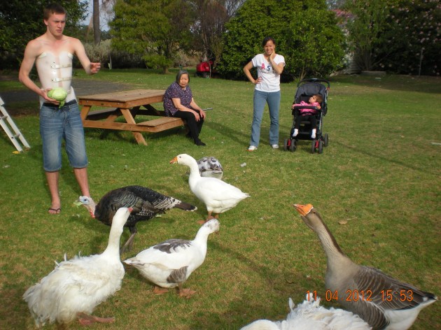 And this is Son in his brace, standing 3 inches taller than he was (I kid you not!) with my mother – and another picture of him feeding the gang with some visitors.