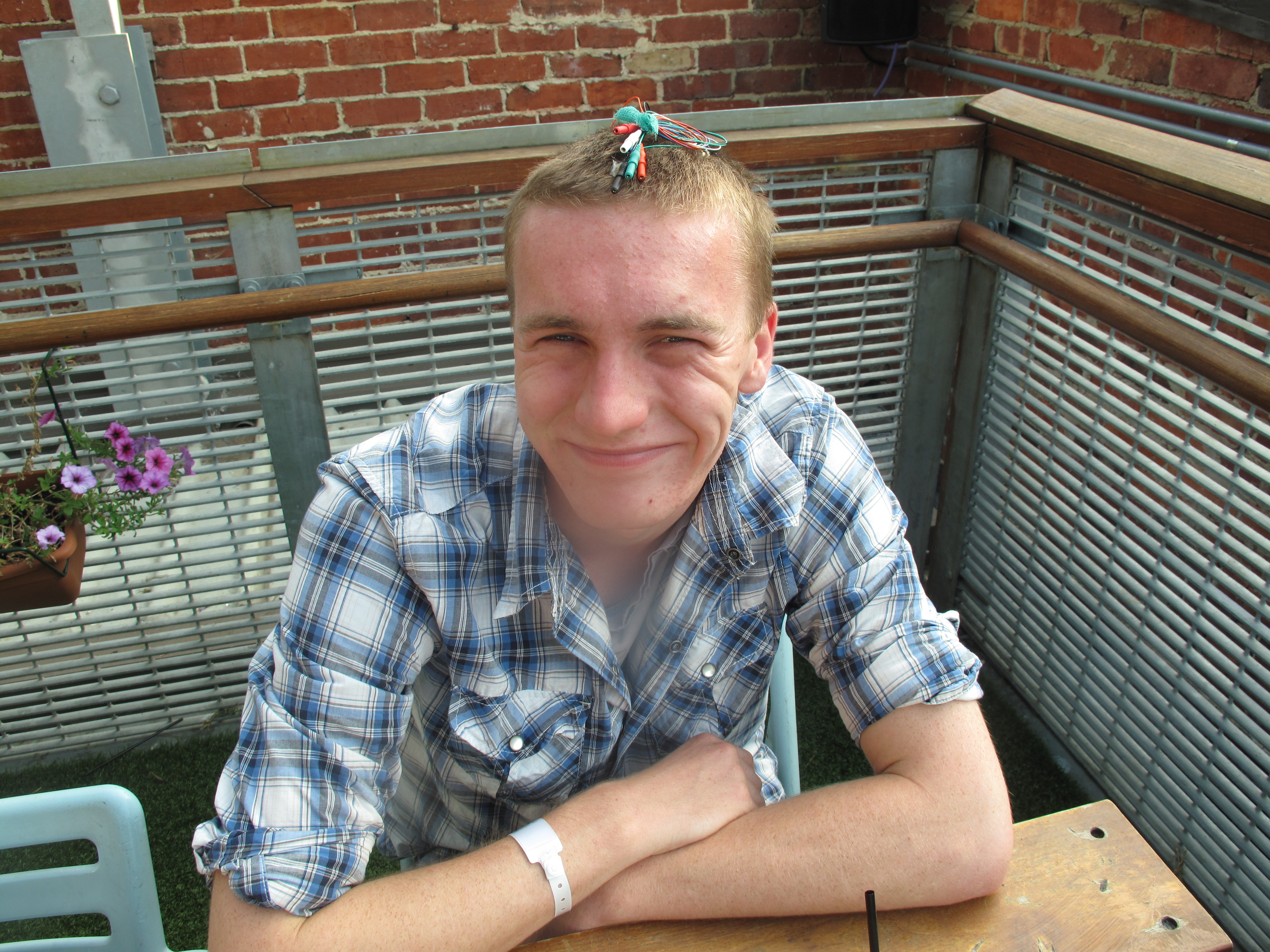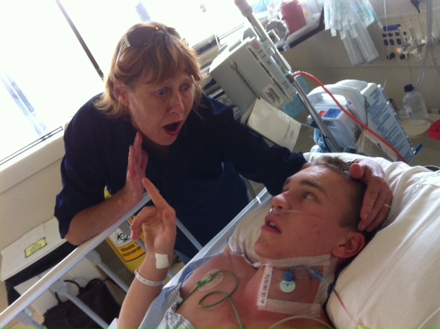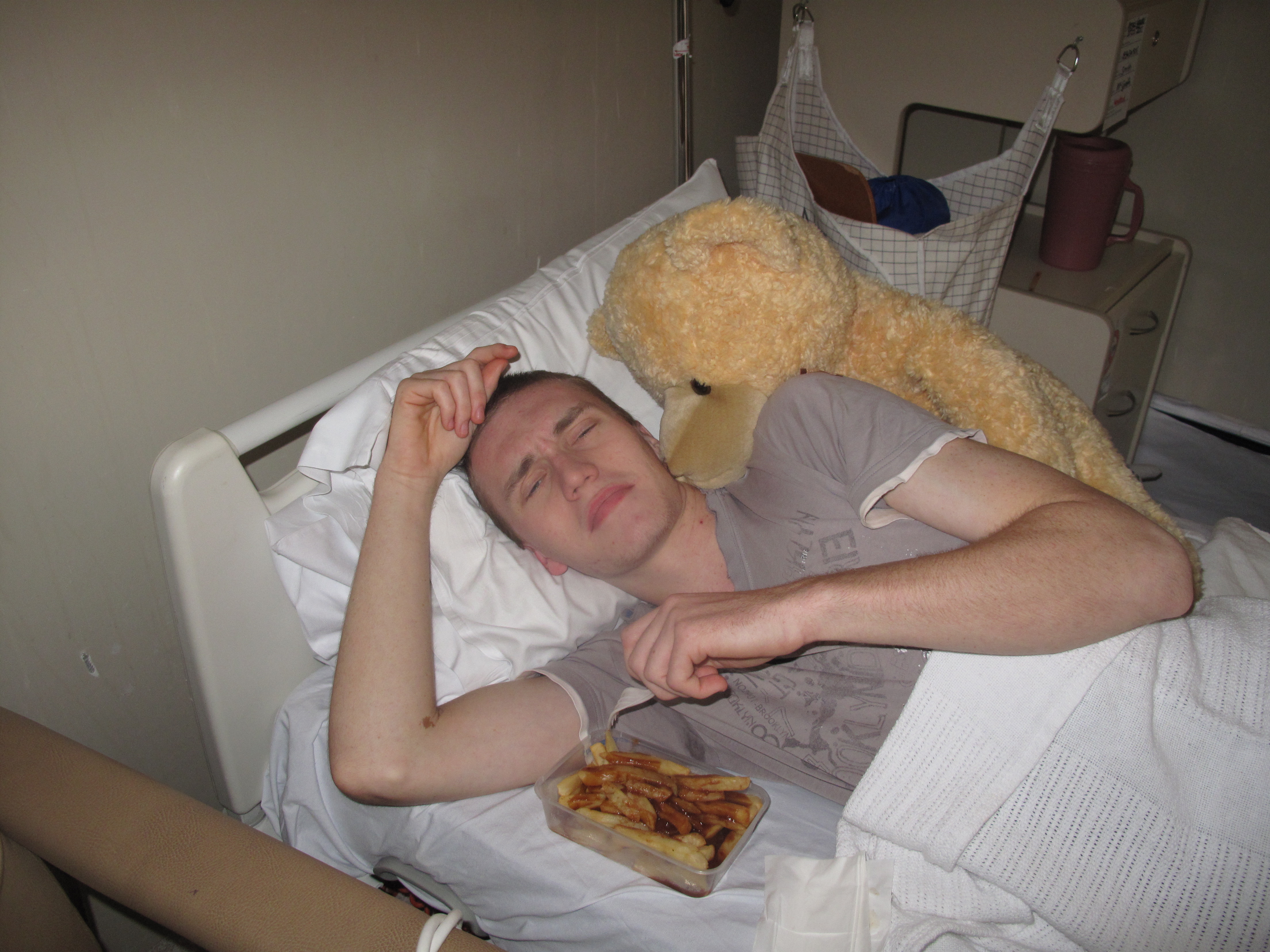 So, on Valentines Day this year (Feb. 14 2012) Son underwent major surgery which took, I think, over eight hours and in which twelve of his vertebrae were fused, using quite a bit of titanium, and bone from the bone bank (a bit like a blood bank). I will spare you the gory details as there are plenty of youtubes on how this works. The following pictures show Son with the electrody things in his hair, the evening before surgery (we were allowed to go out for dinner!), the second is in intensive care after the surgery, the third is us mucking around and trying to be silly, and the fourth is Son a week later in the rehabilitation unit with the teddy I bought him and some gravy and chips!