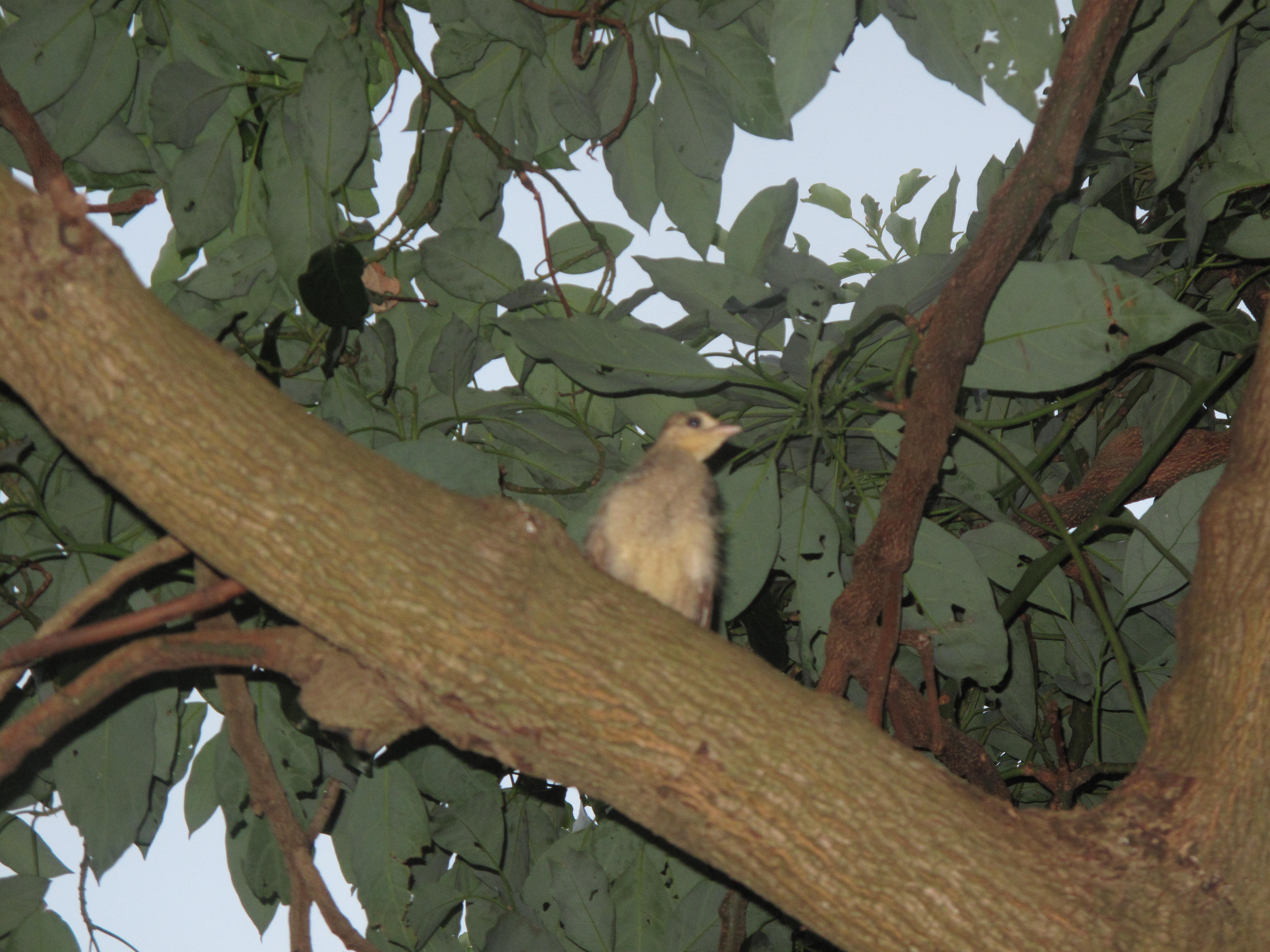 I have maintained a respectful distance but they all come close to me anyway; they trust me and seem to rather like the flash of the camera. The photos I have put here show their long, but enjoyable, journey to bed but this is the first time I have seen the finale. I was amazed to see how the two peachicks can actually fly quite high now from branch to branch, up and up, and until they reach their mother. Queenie clucks until they get to her.