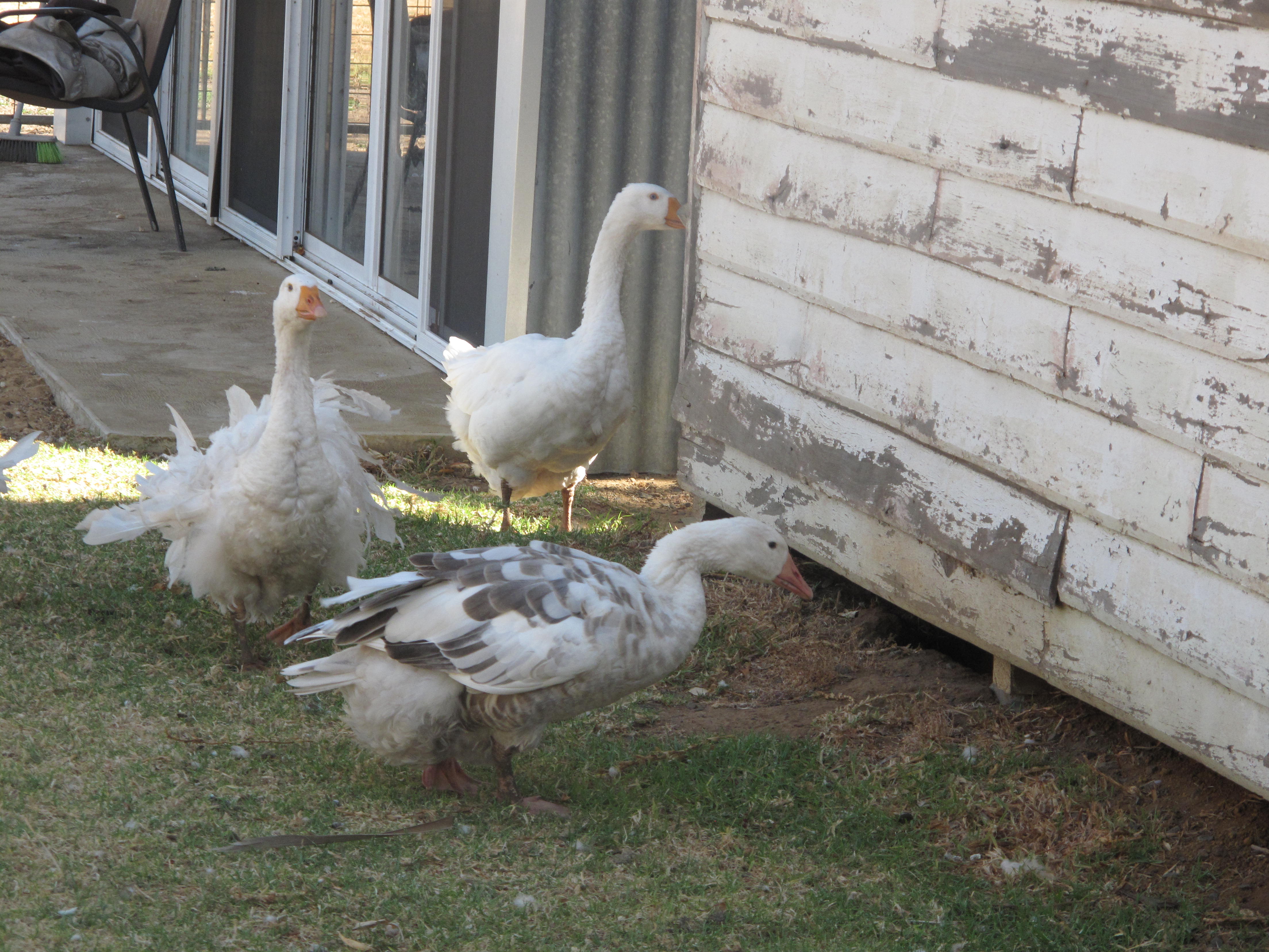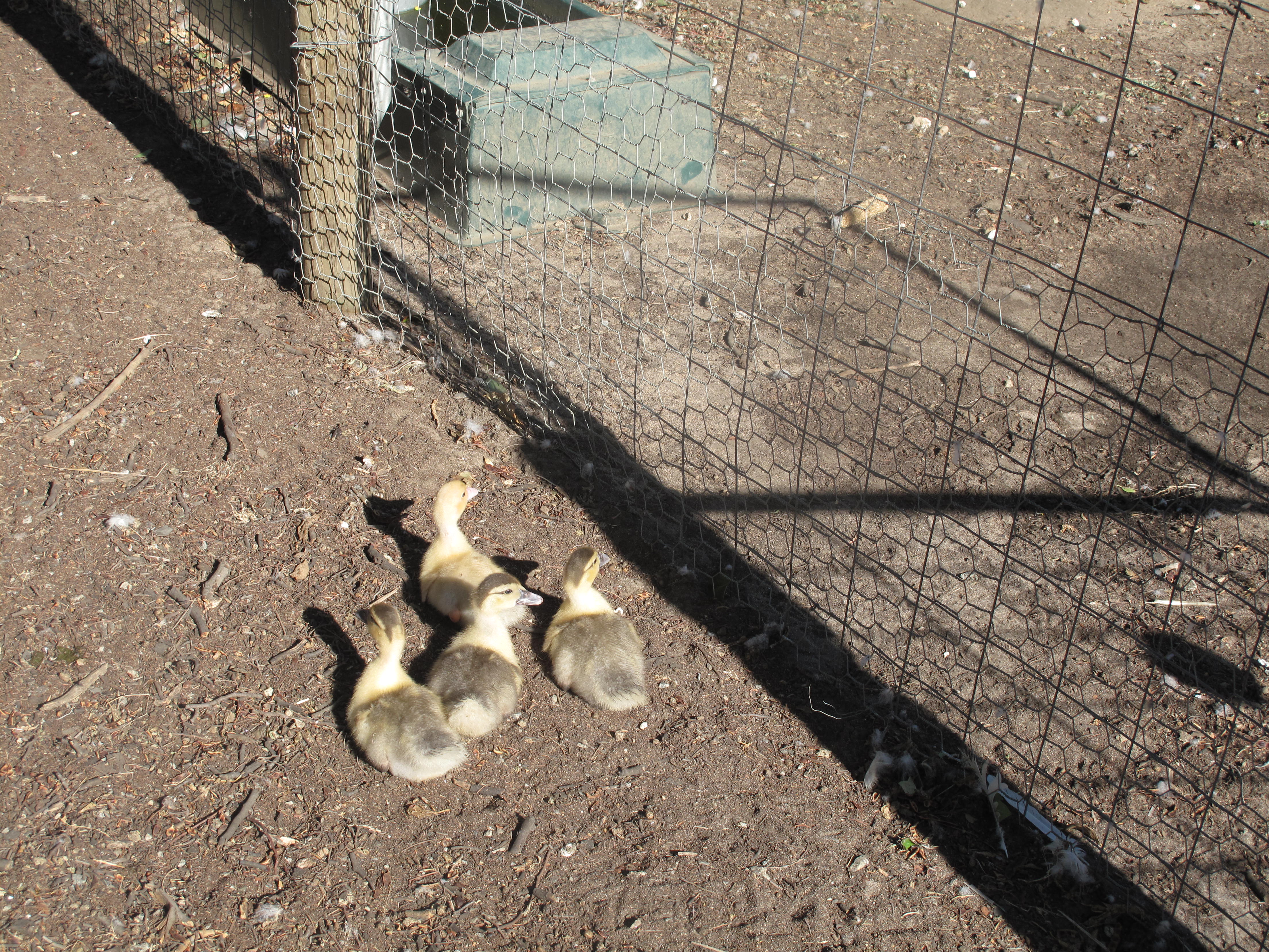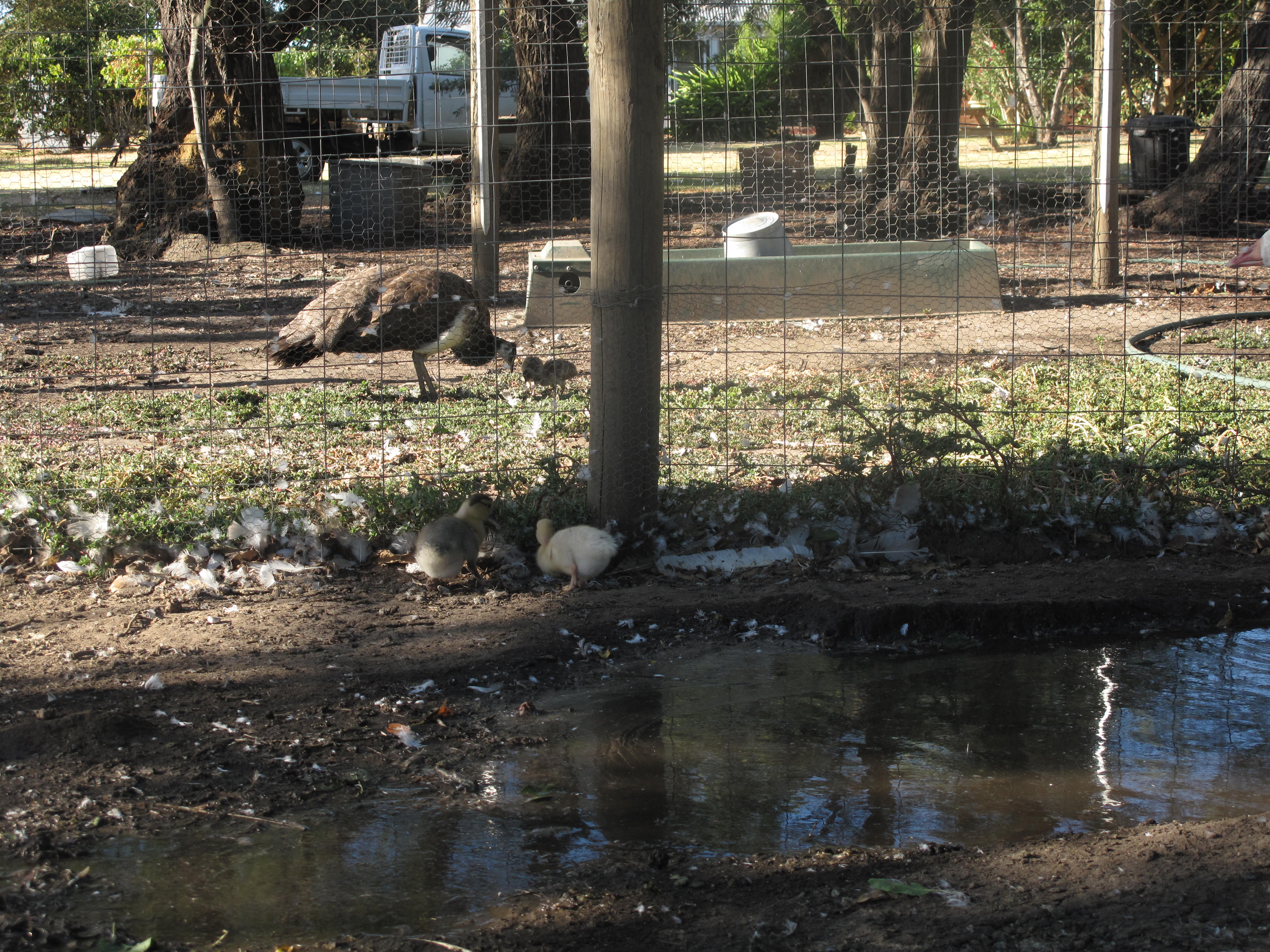 I had put the gang, including ducklings, into their yard for the night, then turned the hose on the avocado tree which is right behind Ming’s shed where he now lives. As soon as I turned the hose on, Michael Jackson squeezed through the fence and began swimming in the growing puddle. The other two ducklings (the ‘Twins’ because they are identical) followed Michael Jackson to the puddle, so I had to let Godfrey out again in order to herd them back in. He gave me his usual ‘look’ – a combination of ferocity and disdain.