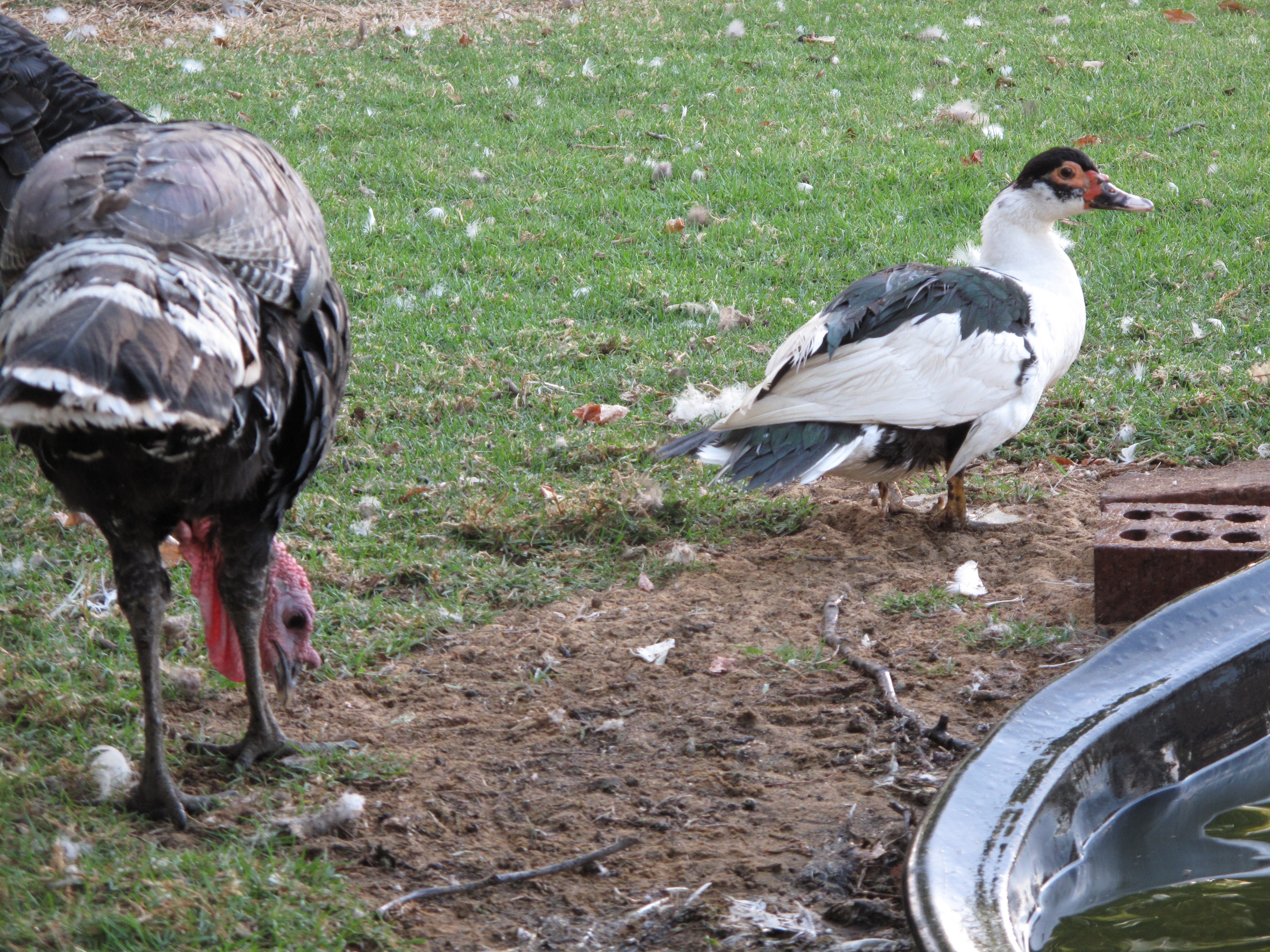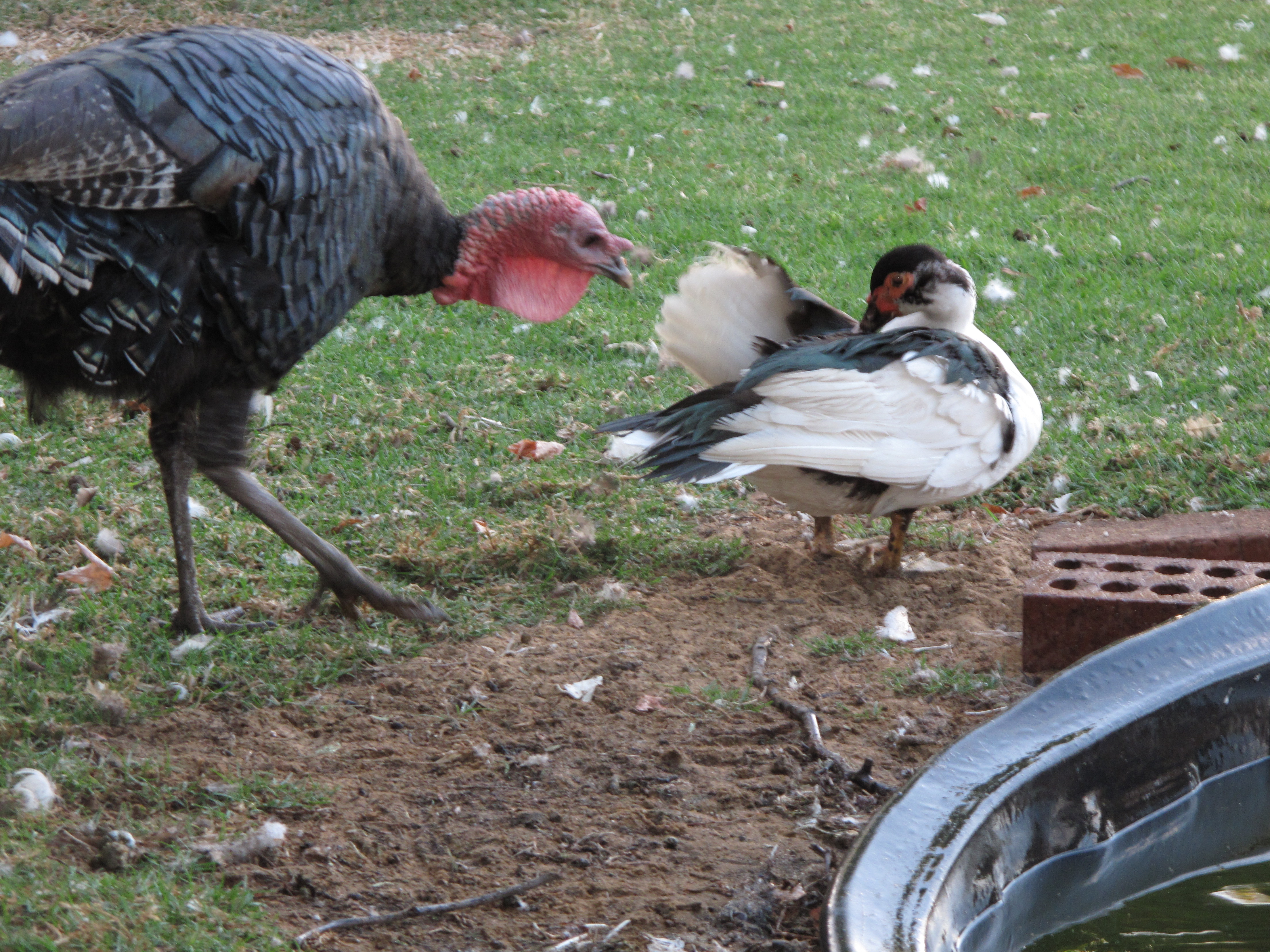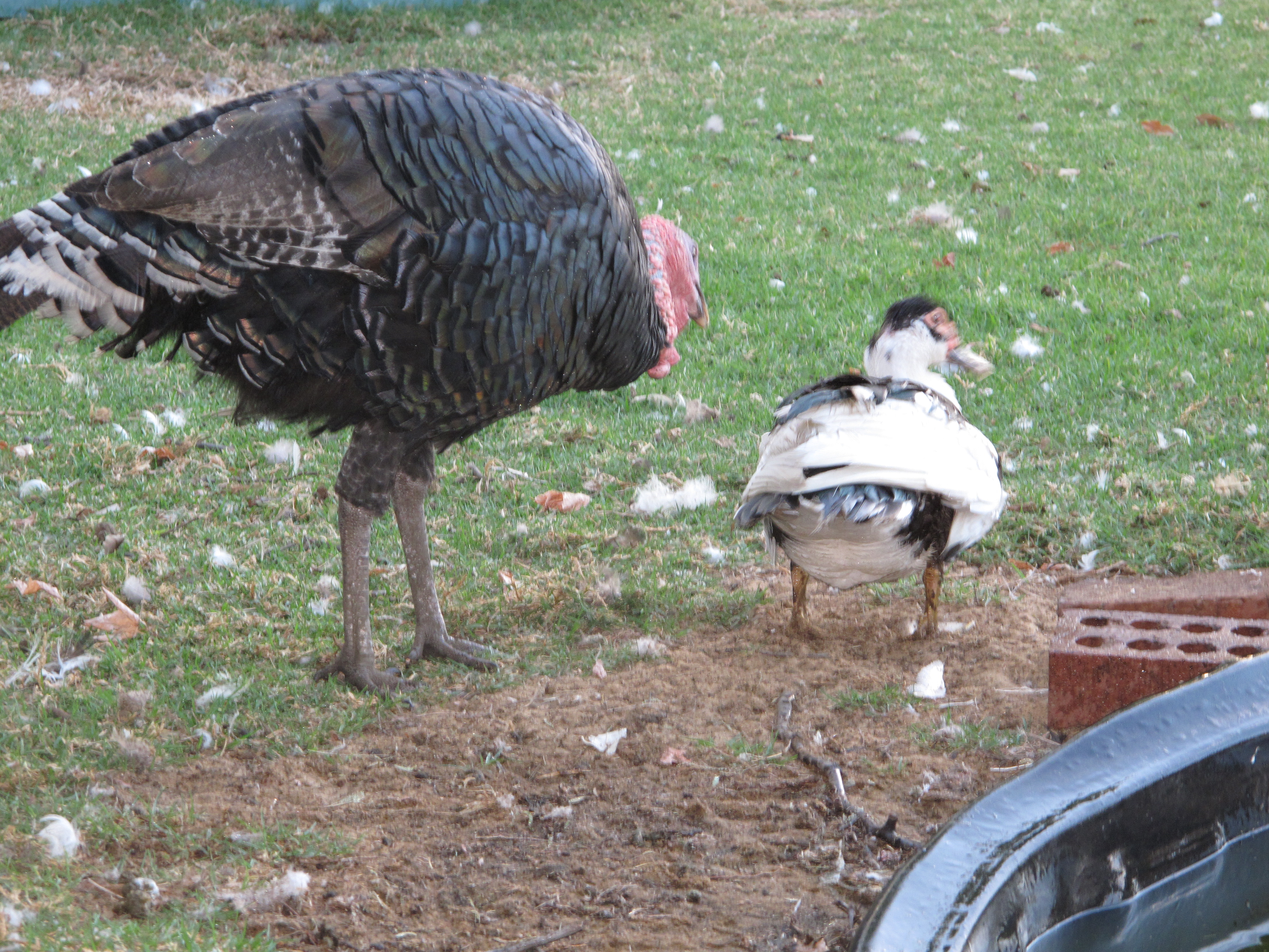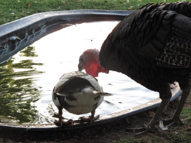 Bubble, the female turkey Tapper was brought up with (there is also a male Bubble), is absolutely delighted to have her best friend back out and about. They are very close as you can see.