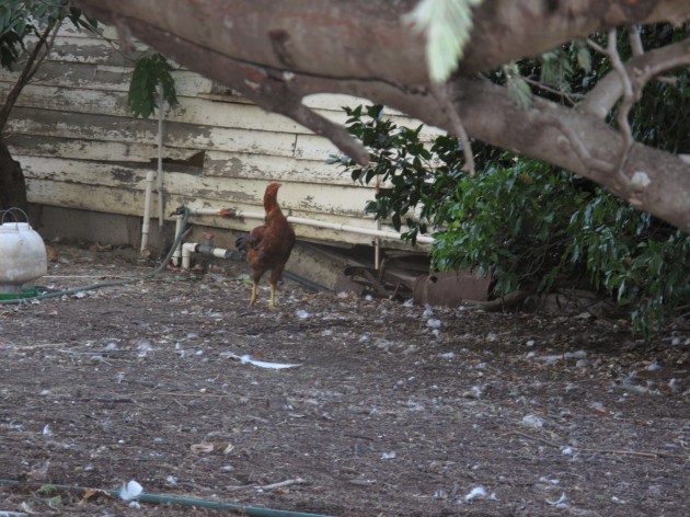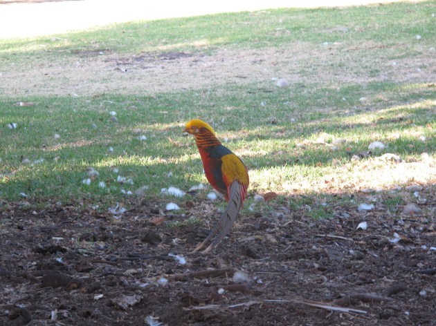 Phoenix 1, our remaining golden pheasant, is in search of a wife – yes indeed. This morning I was amazed to see him flirting with Malay (one of our roosters which might be a hen). Here is Malay in front of one of the old sheds. Malay is the grown up chick belonging to the first Malay who was one of the many hens to disappear courtesy of the fox. S/he is twice the size of Phoenix 1.