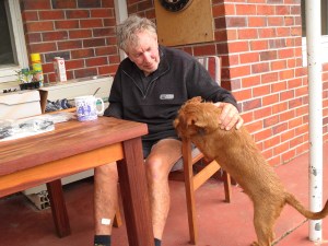 The photo is from two years ago with ‘Doc’ (now deceased) on Anthony’s lap, and ‘Jack’ the Irish terrier we got Anthony as a surprise birthday present when he still lived here at home.